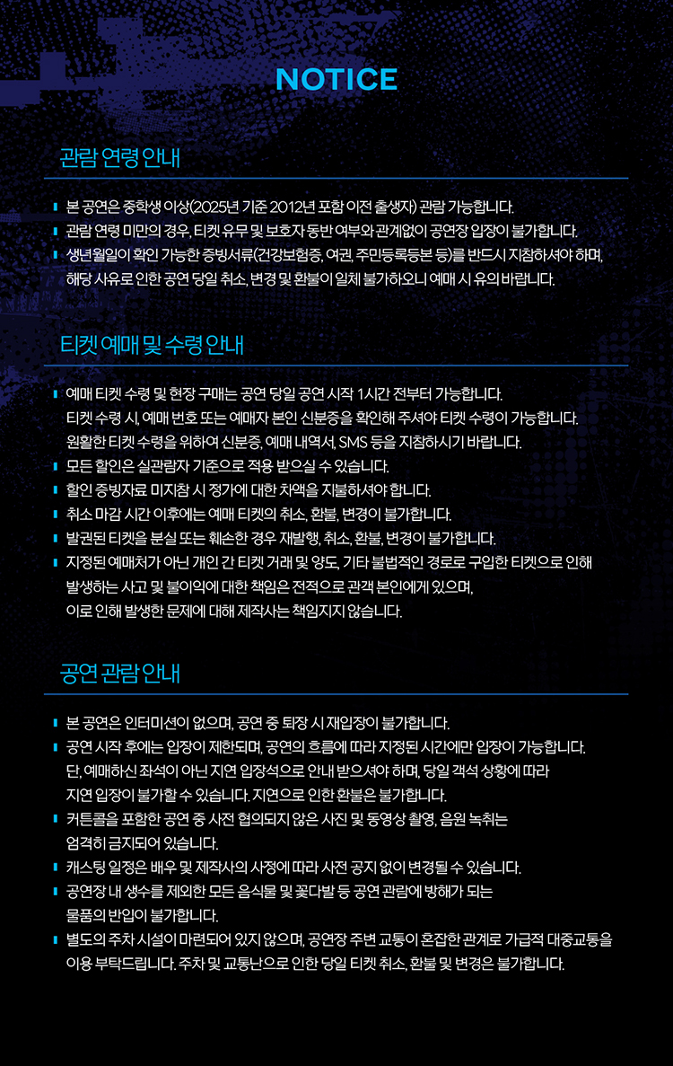 - 특정 기간, 특정 공연일에만 판매하는 가격이 있으니 예매 전 [가격 전체 보기]를 눌러 확인해 주세요.
