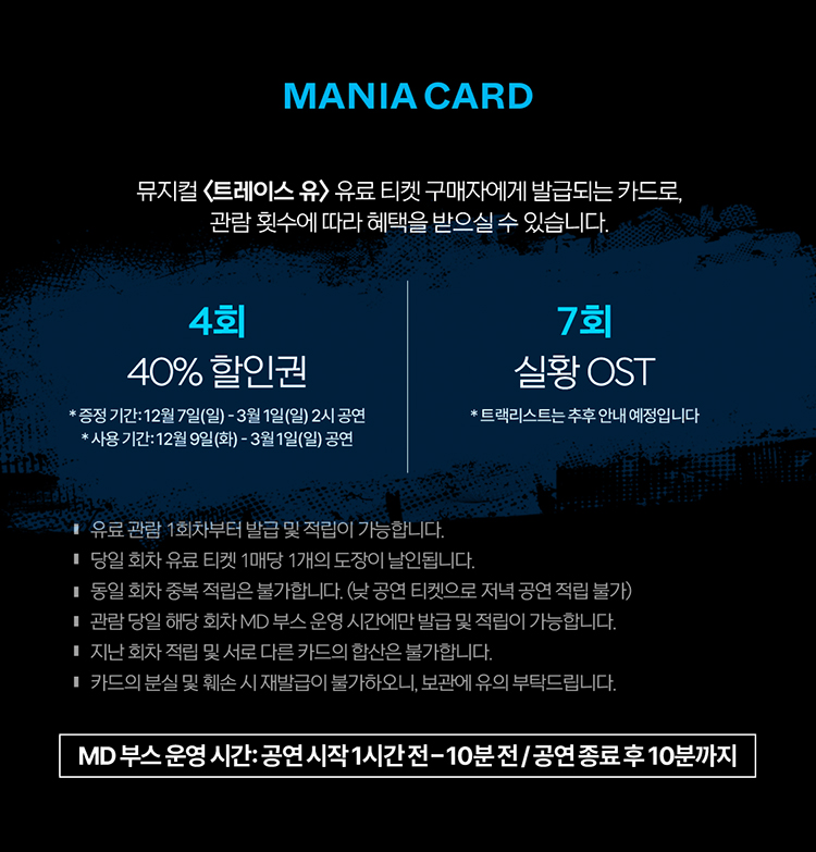 - 관람일 2일전 ~ 취소기한까지: 티켓금액의 30%
