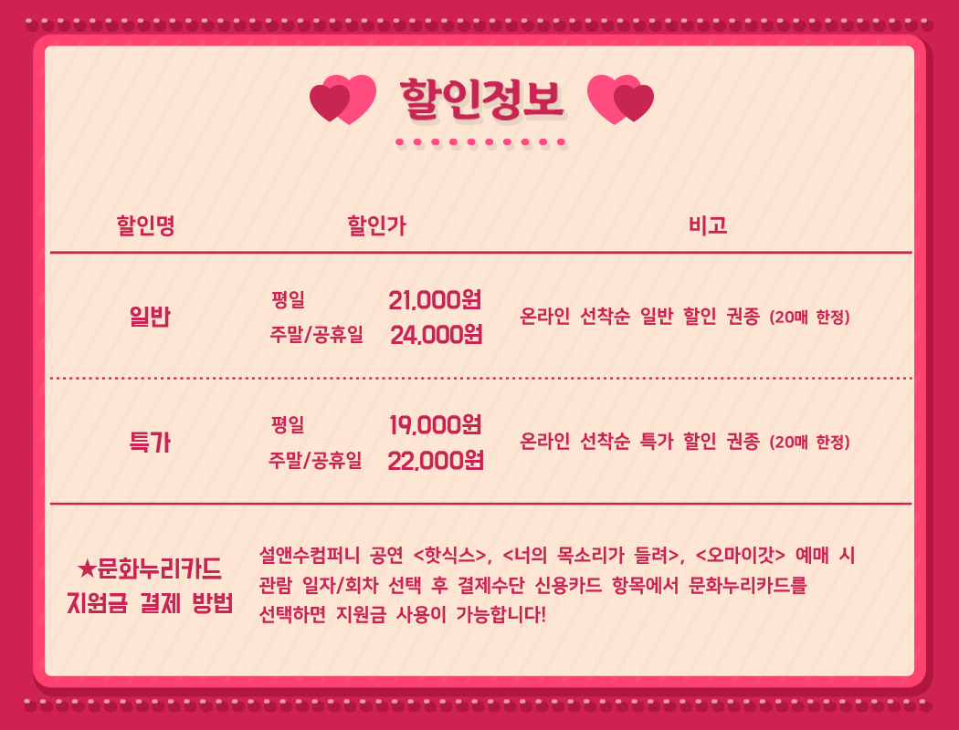 - 특정 기간, 특정 공연일에만 판매하는 가격이 있으니 예매 전 [가격 전체 보기]를 눌러 확인해 주세요.