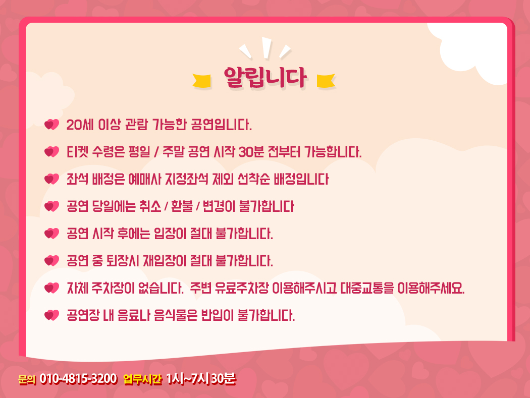 - 예매 후 7일 이내 취소시 티켓 금액 전액이 환불됩니다.(예매 수수료 제외)