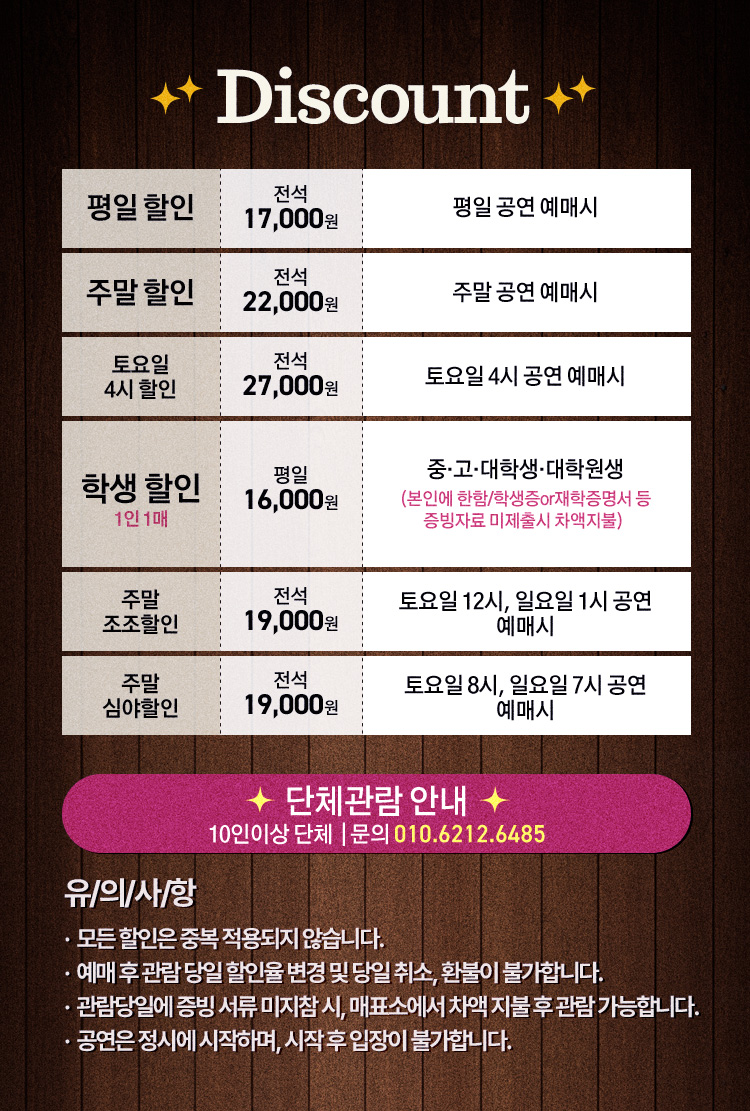 - 특정 기간, 특정 공연일에만 판매하는 가격이 있으니 예매 전 [가격 전체 보기]를 눌러 확인해 주세요.