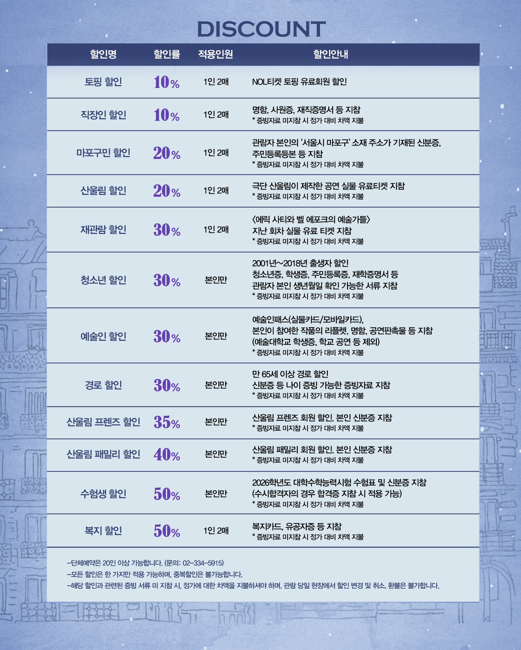 평일 8시 | 주말 및 공휴일 4시 | 화 공연 없음