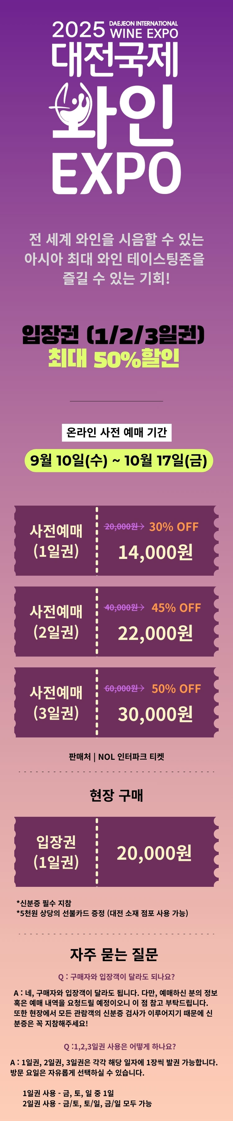 대한민국 최대 와인 축제, 대전 국제 와인 EXPO 2025가 17개국 230여 개의 와인·전통주 브랜드와 함께 대전에서 화려하게 펼쳐집니다. 이탈리아, 스페인, 프랑스, 독일, 미국 등 세계 주요 산지의 와인을 마음껏 즐길 수 있는 아시아 최대 무료 와인 테이스팅 존을 비롯해, 스파클링 와인쇼와 라이브 와인 경매 등 특별한 프로그램이 준비되어 있습니다.