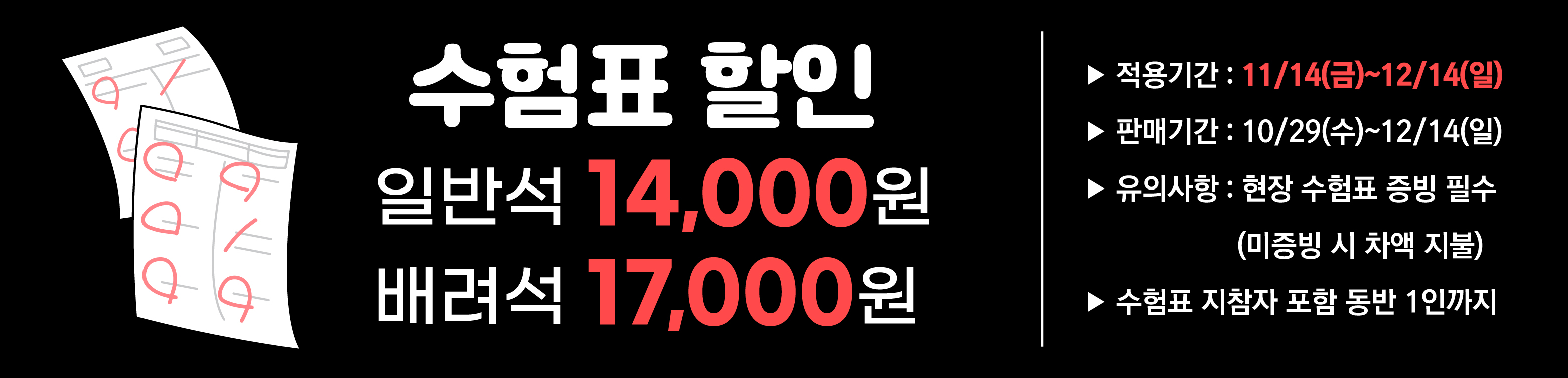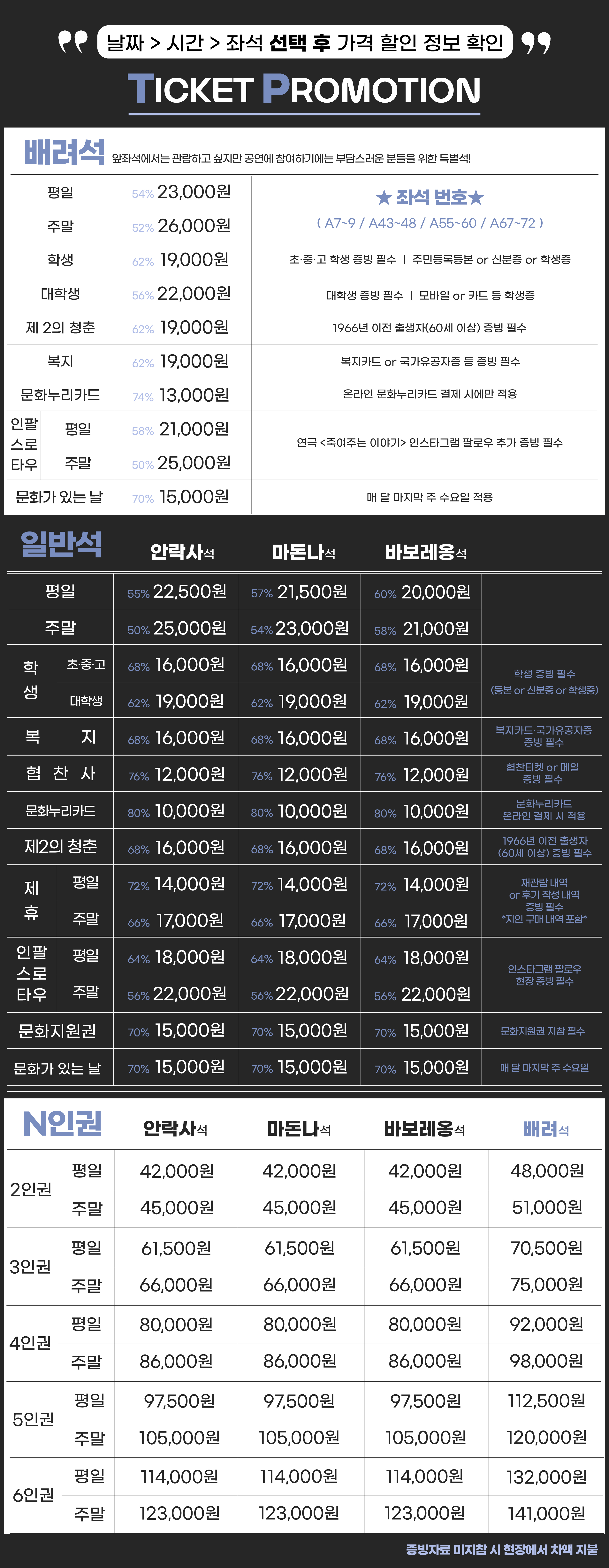 - 특정 기간, 특정 공연일에만 판매하는 가격이 있으니 예매 전 [가격 전체 보기]를 눌러 확인해 주세요.