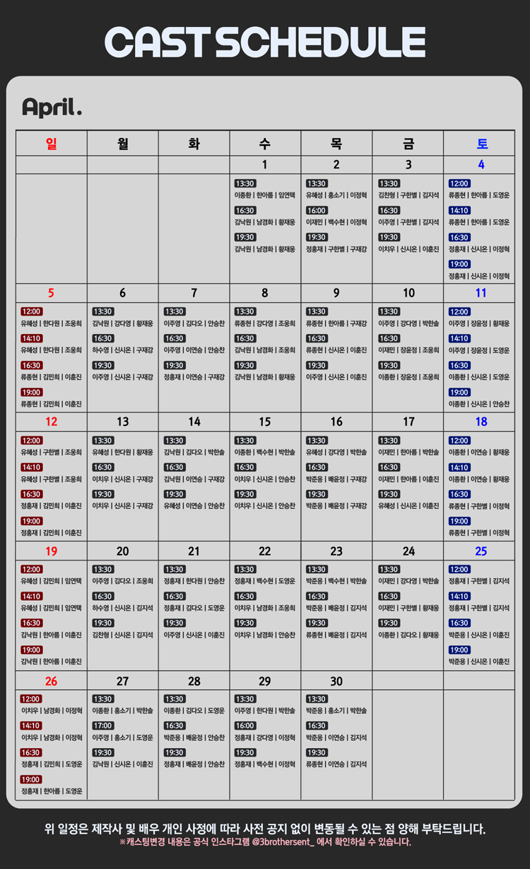 - 4월 29일(수) : 13:30 / 16:00 / 19:30 (2회차 시간변경)
