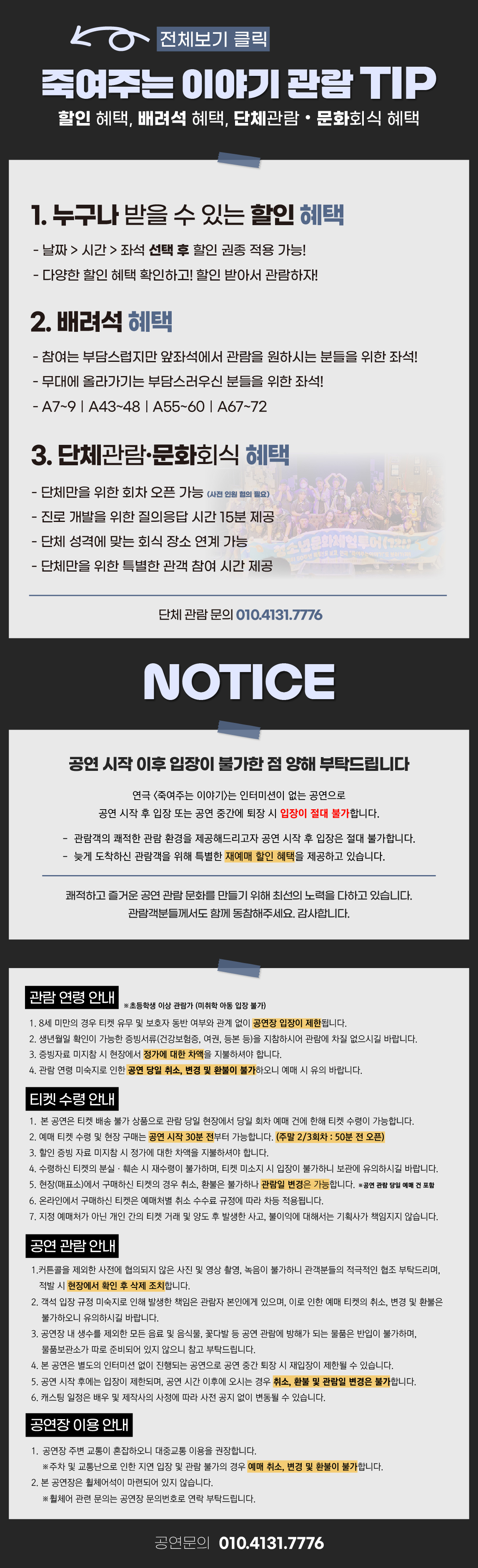 * 자세한 공연시간은 관람일 회차 선택시 확인하여 주시기 바랍니다.