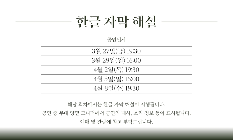 월-금 19:30, 일 16:00 (※토요일 공연 없음)