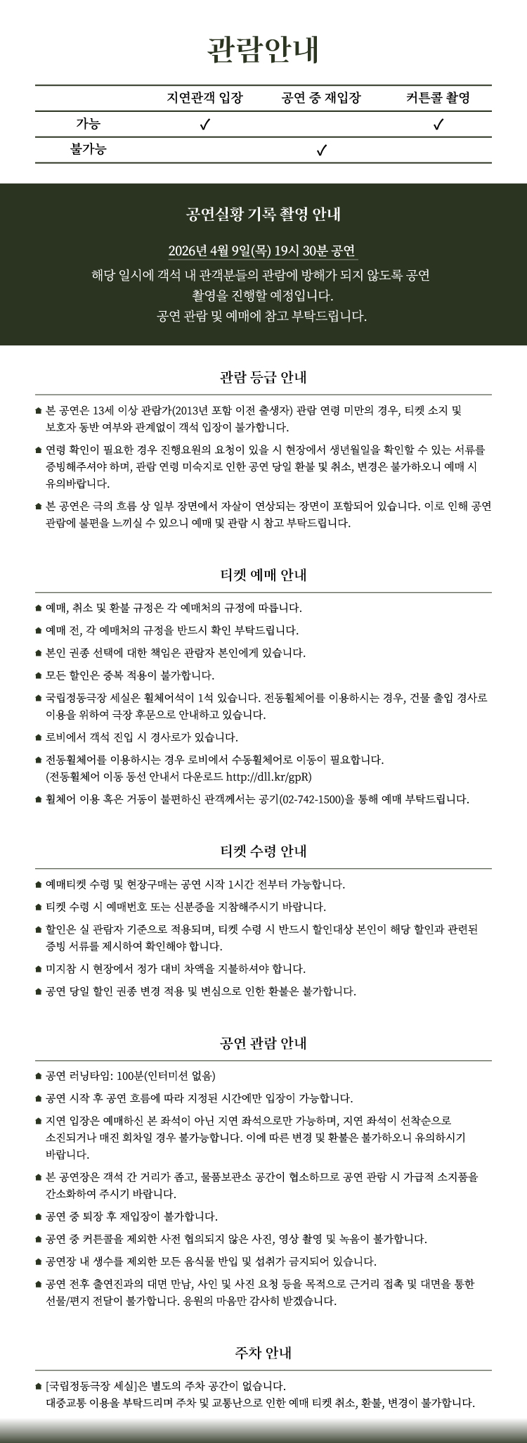 - 관람일 2일전 ~ 취소기한까지: 티켓금액의 30%