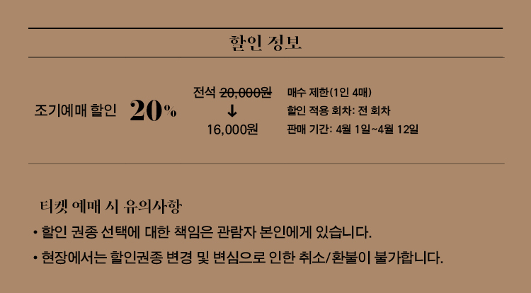 - 특정 기간, 특정 공연일에만 판매하는 가격이 있으니 예매 전 [가격 전체 보기]를 눌러 확인해 주세요.