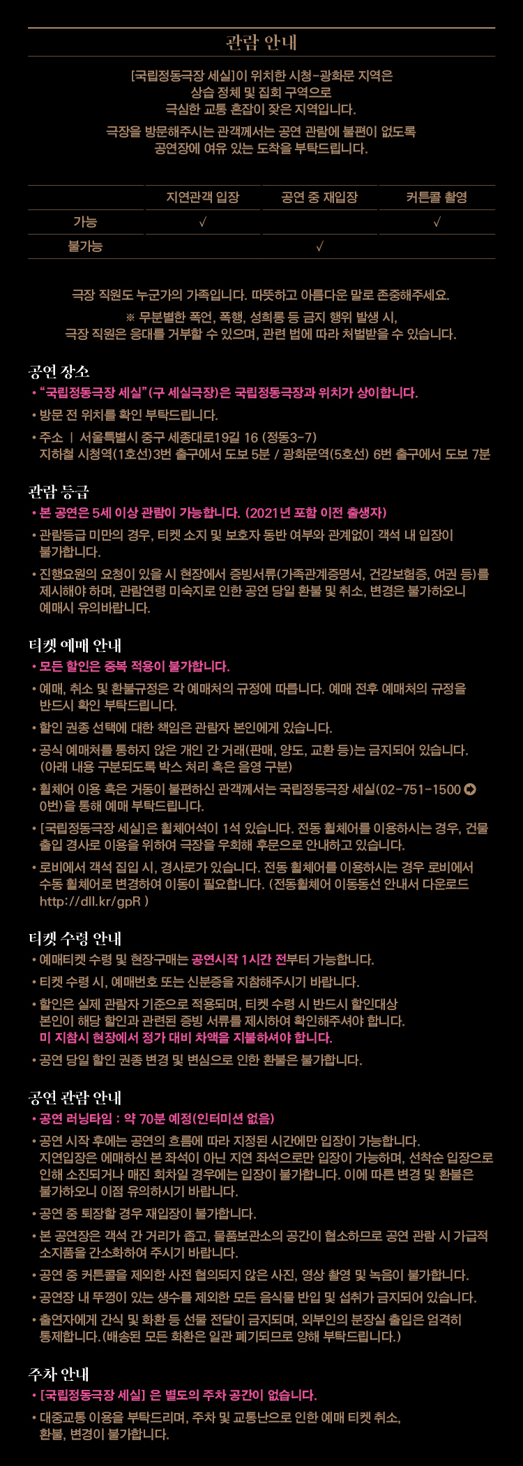 - 관람일 2일전 ~ 취소기한까지: 티켓금액의 30%
