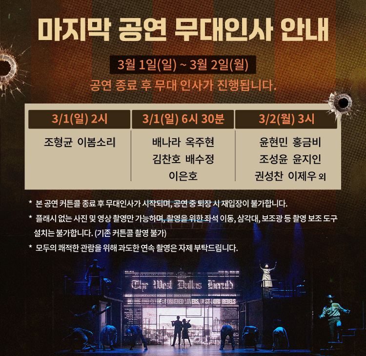 * 단, 2/18(수) 3/1(일) 2시, 6시 30분, 2/16(월) 3/2(월) 3시 공연 (2/17(화) 공연없음)