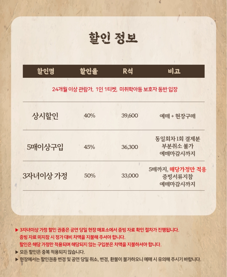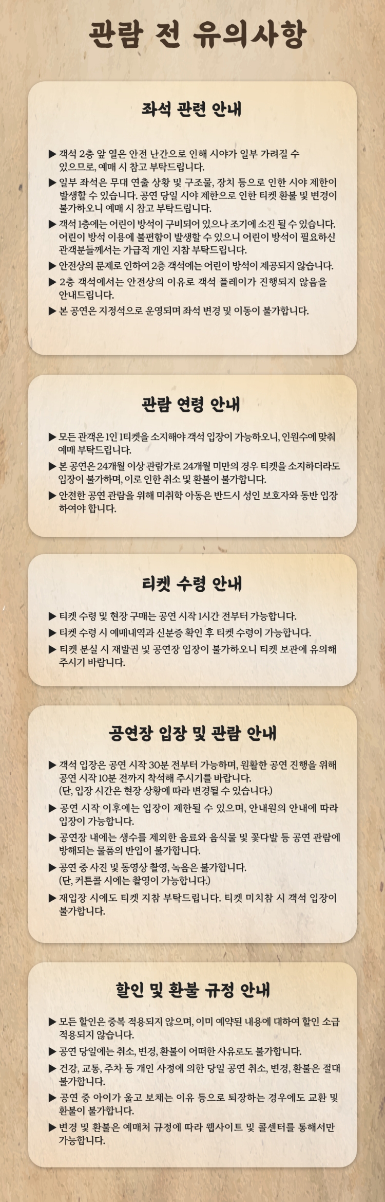 - 관람일 2일전 ~ 취소기한까지: 티켓금액의 30%