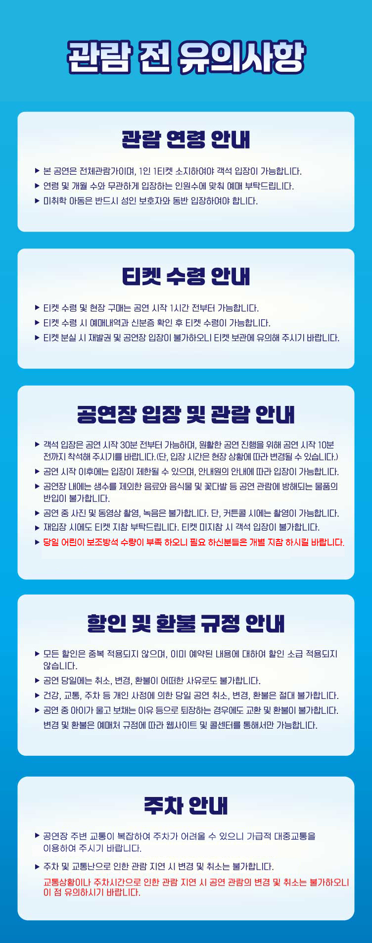 - 예매 후 7일 이내 취소시 티켓 금액 전액이 환불됩니다.(예매 수수료 제외)