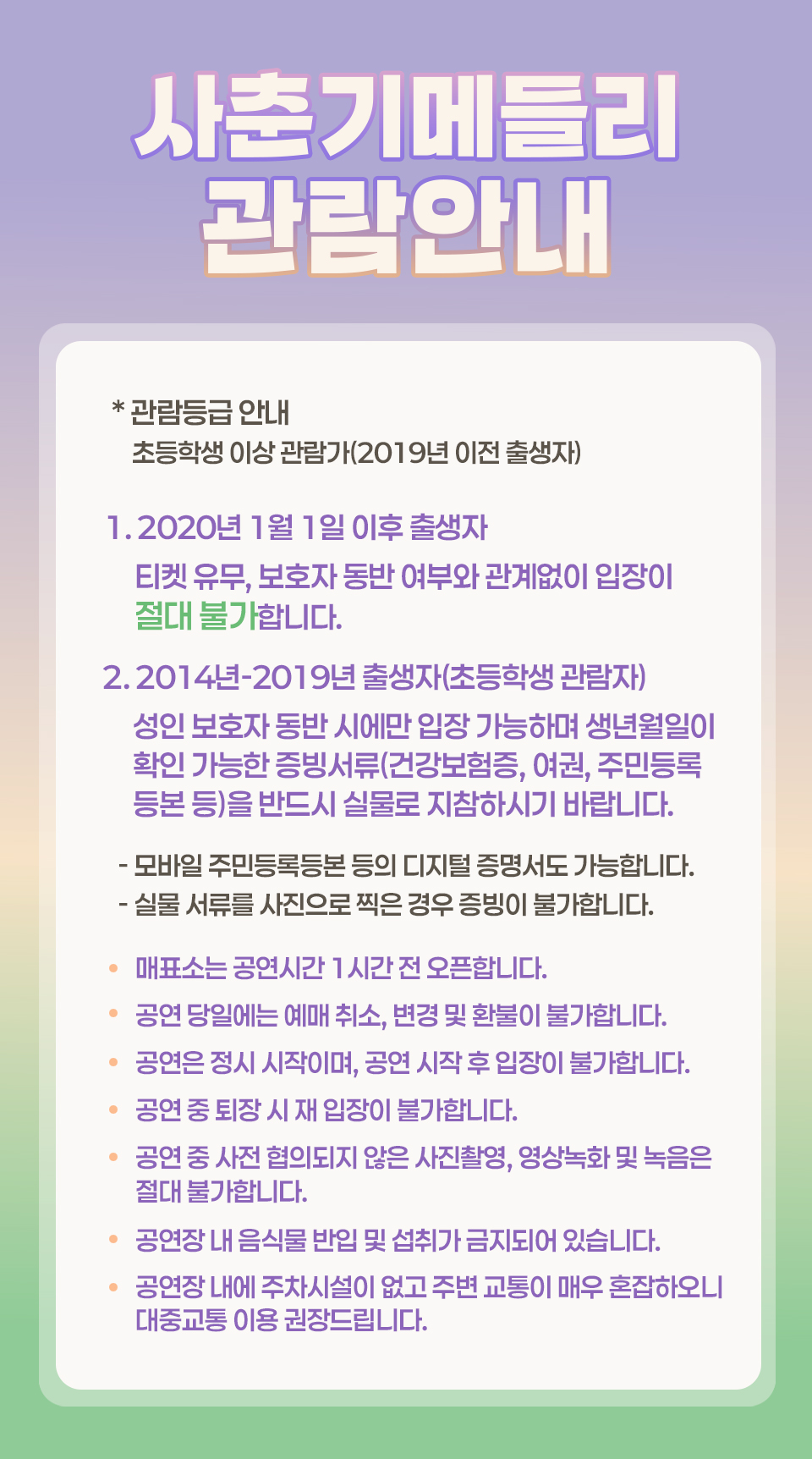 - 예매 후 7일 이내 취소시 티켓 금액 전액이 환불됩니다.(예매 수수료 제외)