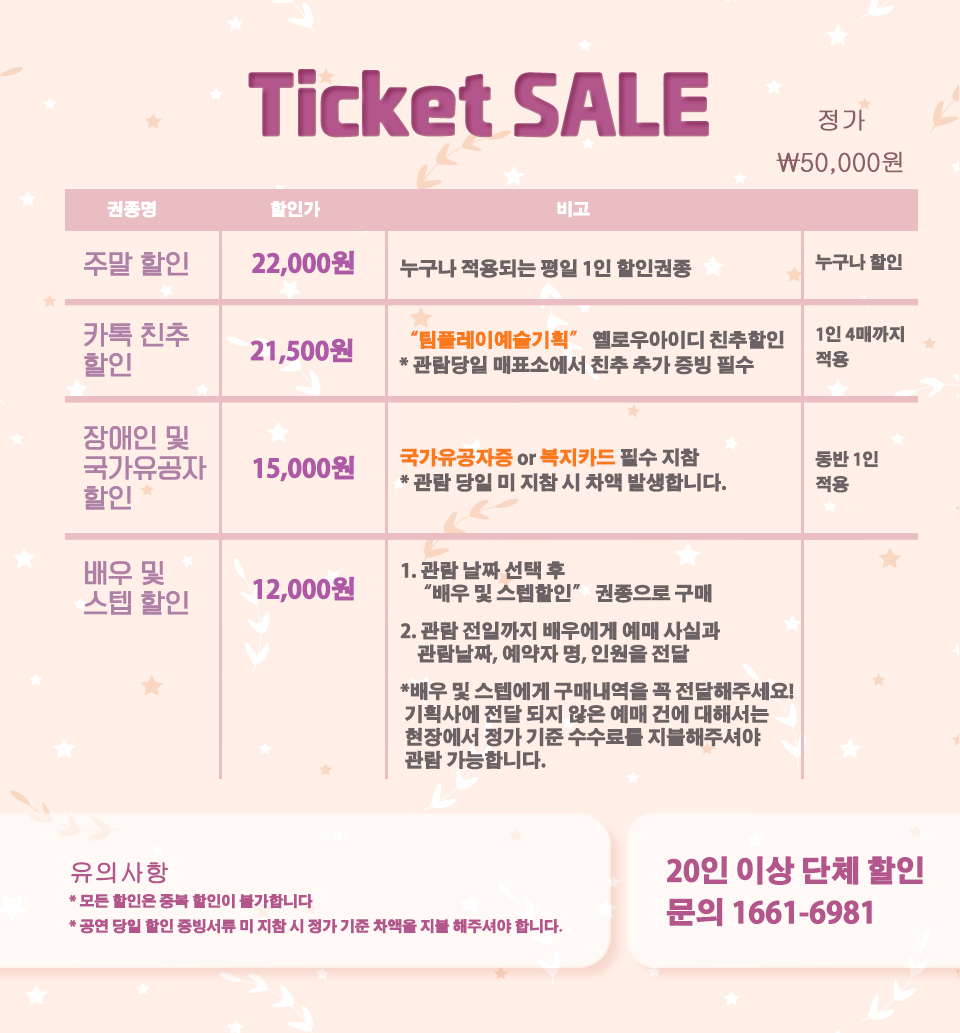 - 특정 기간, 특정 공연일에만 판매하는 가격이 있으니 예매 전 [가격 전체 보기]를 눌러 확인해 주세요.