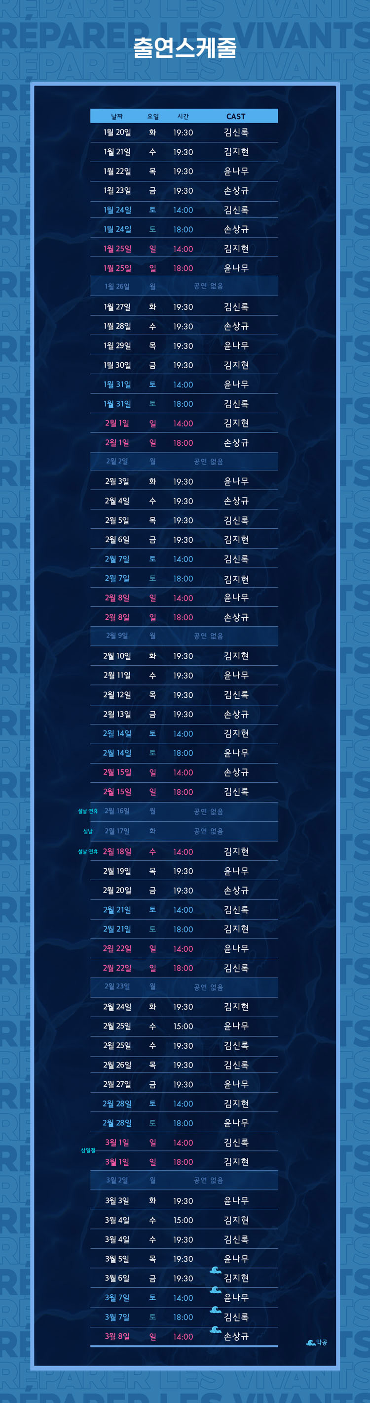 ※ 02.17(화) 공연 없음ㅣ02.18(수), 03.08(일) 14:00 공연만 있음ㅣ02.25(수), 03.04(수) 15:00, 19:30 공연