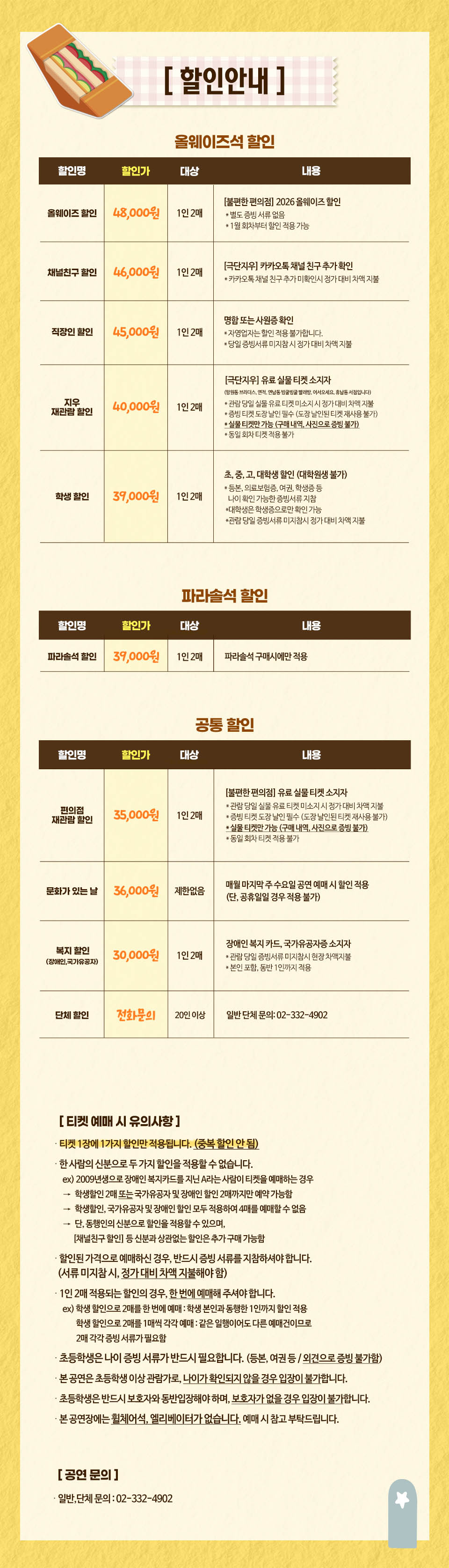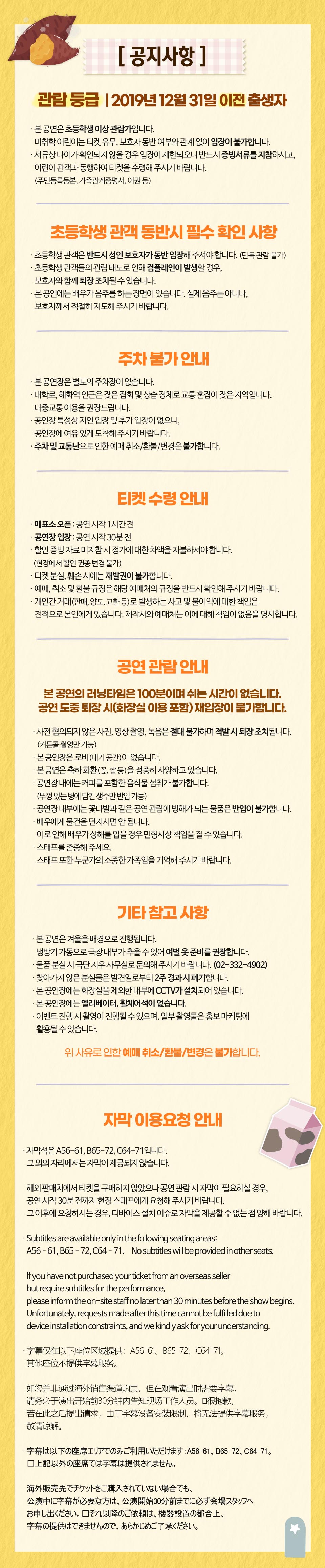 수~금 19:30 / 토 14:00, 17:00 (3월부터 13:30, 17:30) / 일 14:00 / 월,화 휴관