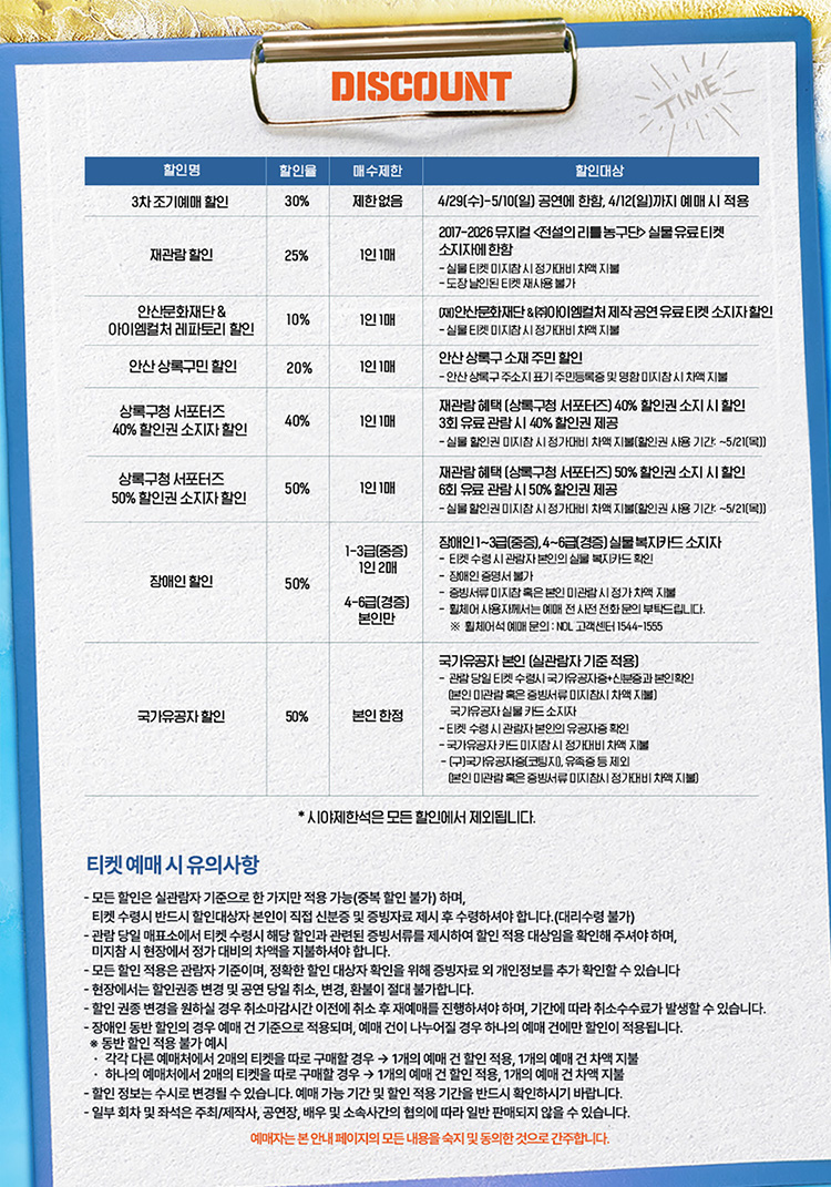- 관람일 2일전 ~ 취소기한까지: 티켓금액의 30%