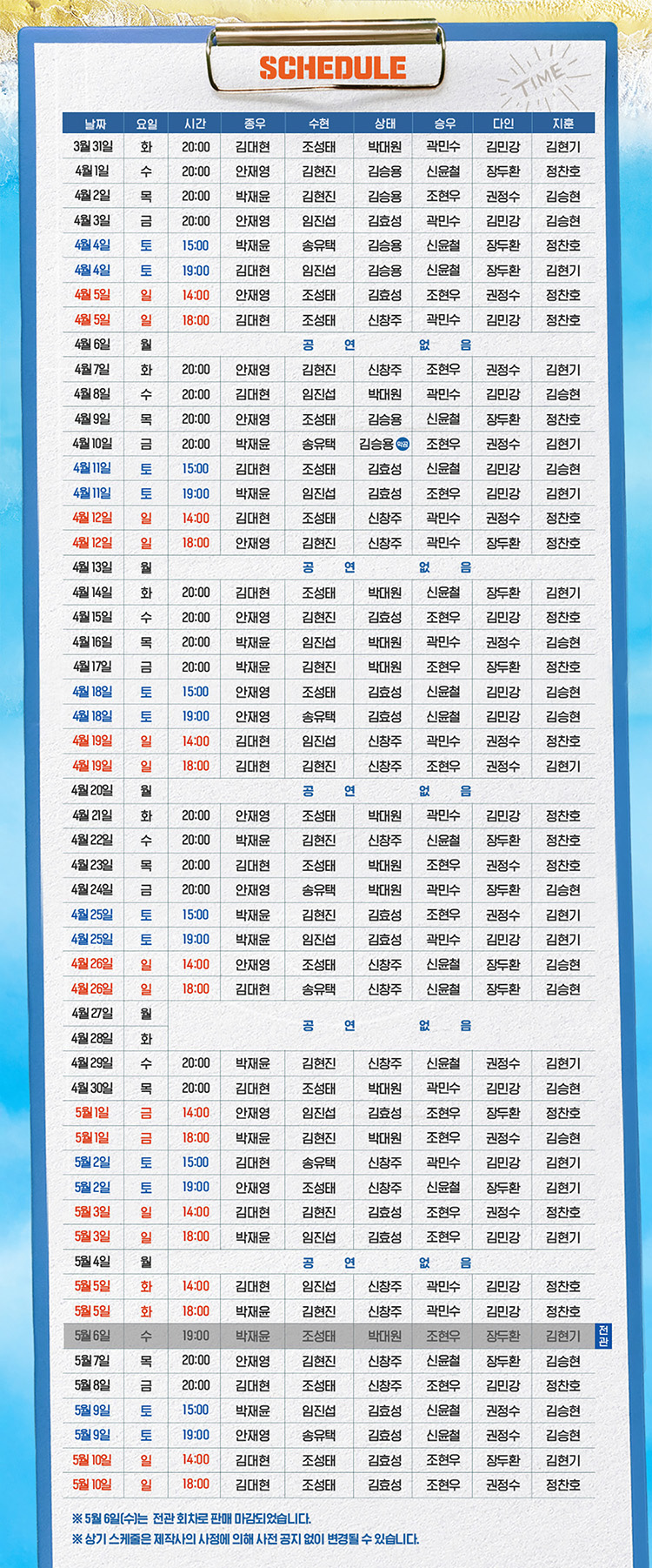 단, 4/28(화) 공연 없음. 5/1(금) 2시, 6시 공연 진행