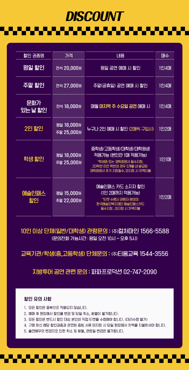 - 특정 기간, 특정 공연일에만 판매하는 가격이 있으니 예매 전 [가격 전체 보기]를 눌러 확인해 주세요.