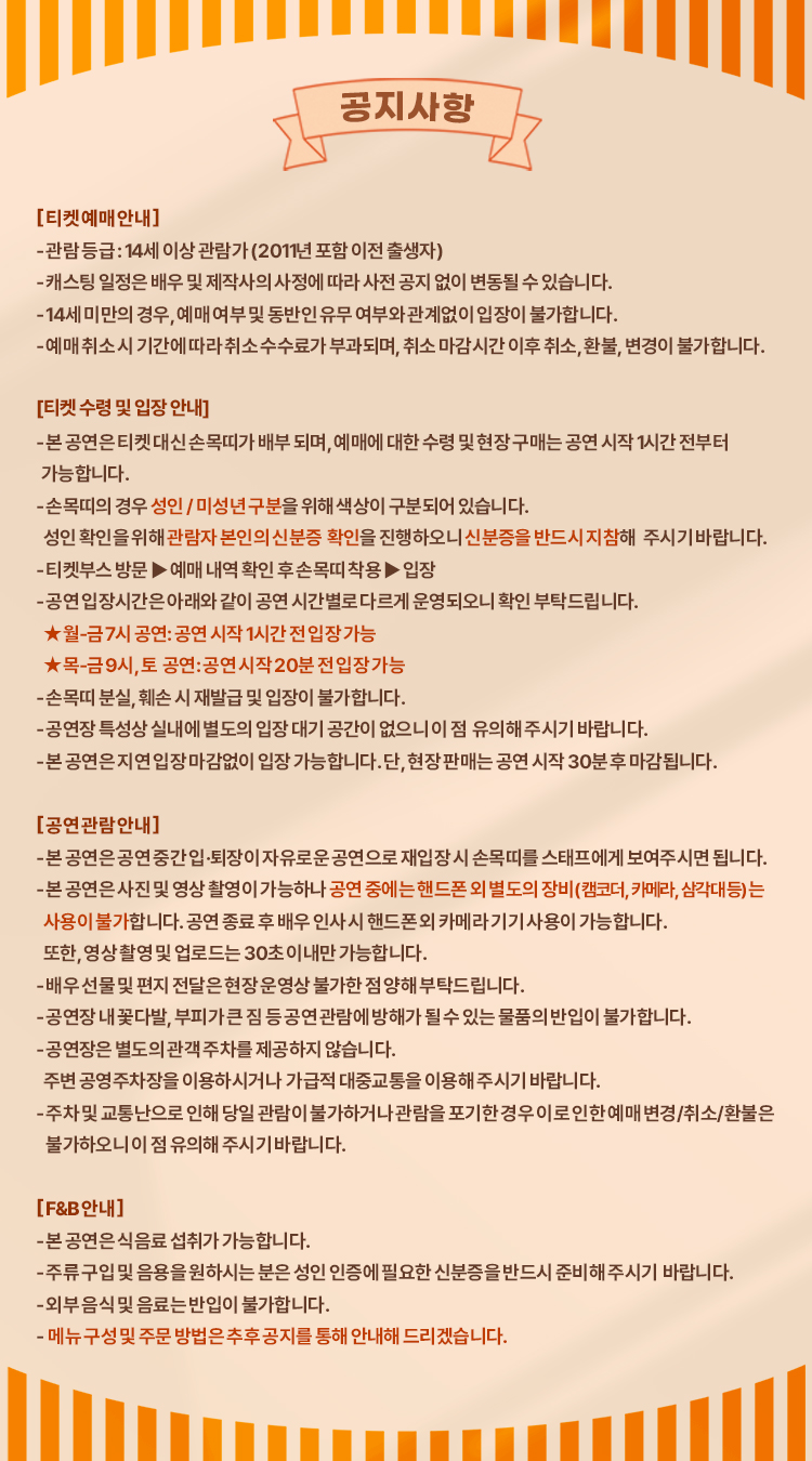 - 관람일 2일전 ~ 취소기한까지: 티켓금액의 30%