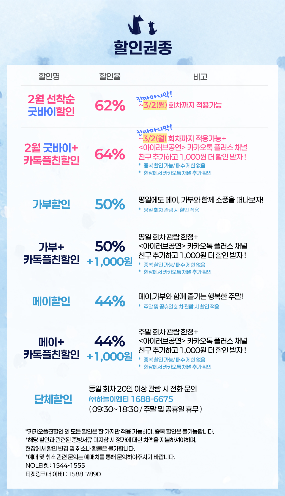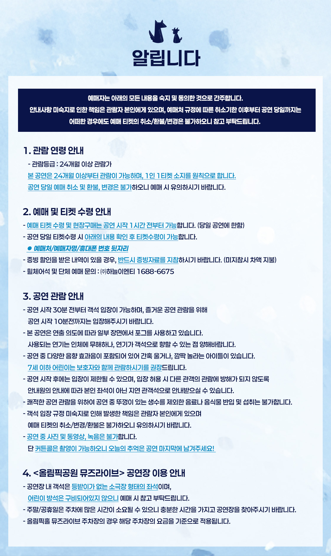 - 예매 후 7일 이내 취소시 티켓 금액 전액이 환불됩니다.(예매 수수료 제외)