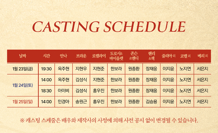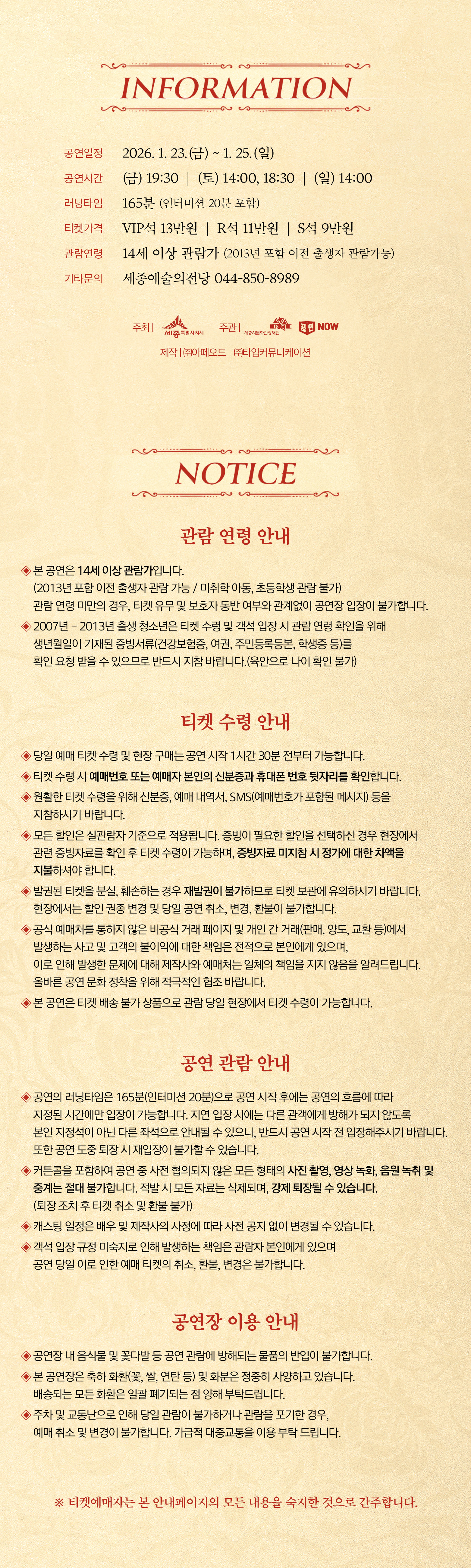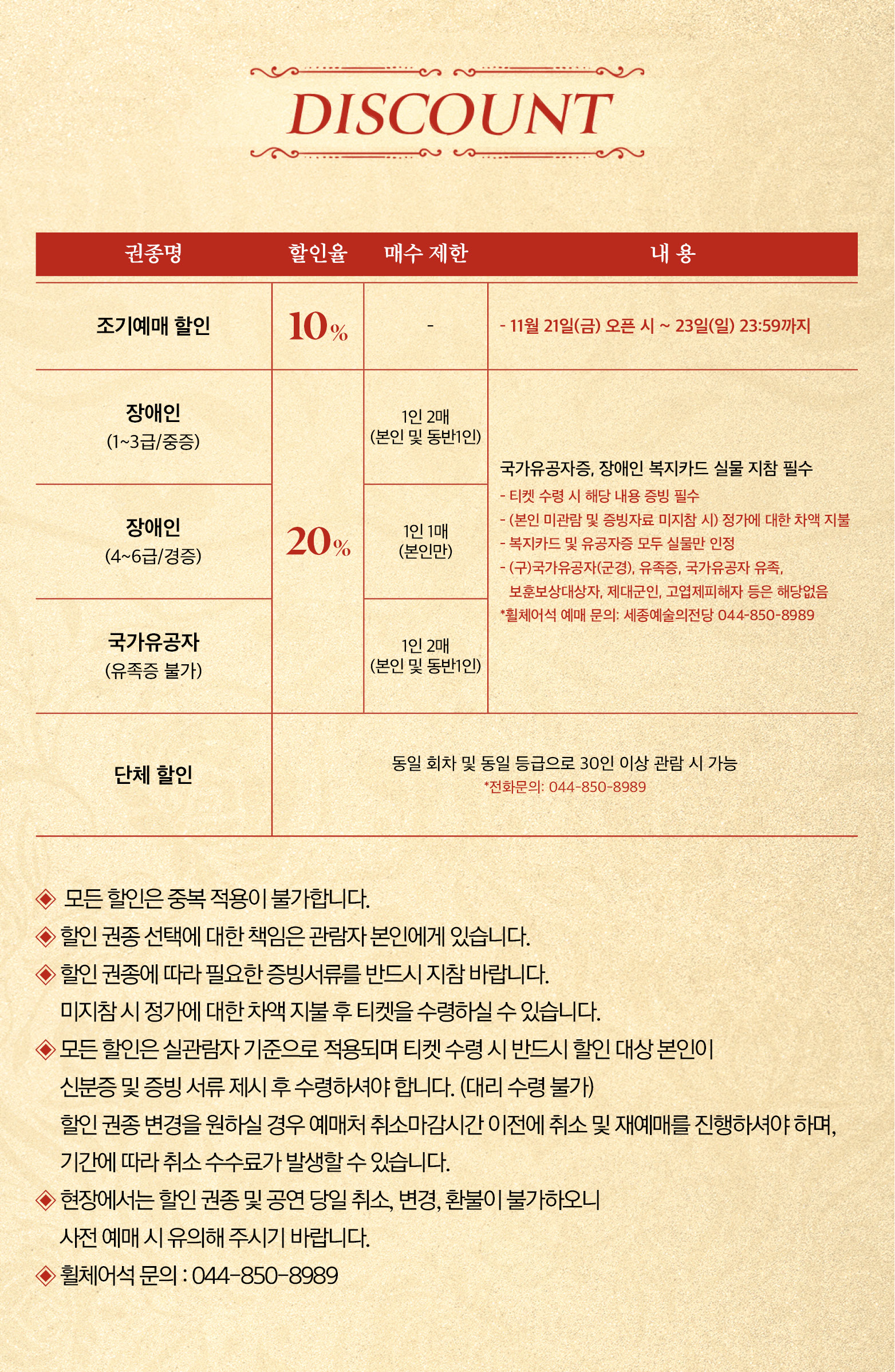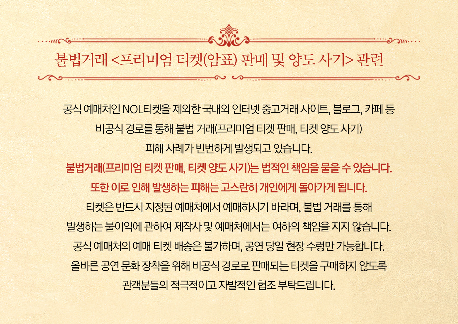 ※ 취소 마감 시간 이후 신규 예매 시 (취소 마감시간 이후 ~ 회차별 공연 5시간 전까지) 예매 취소/변경 불가