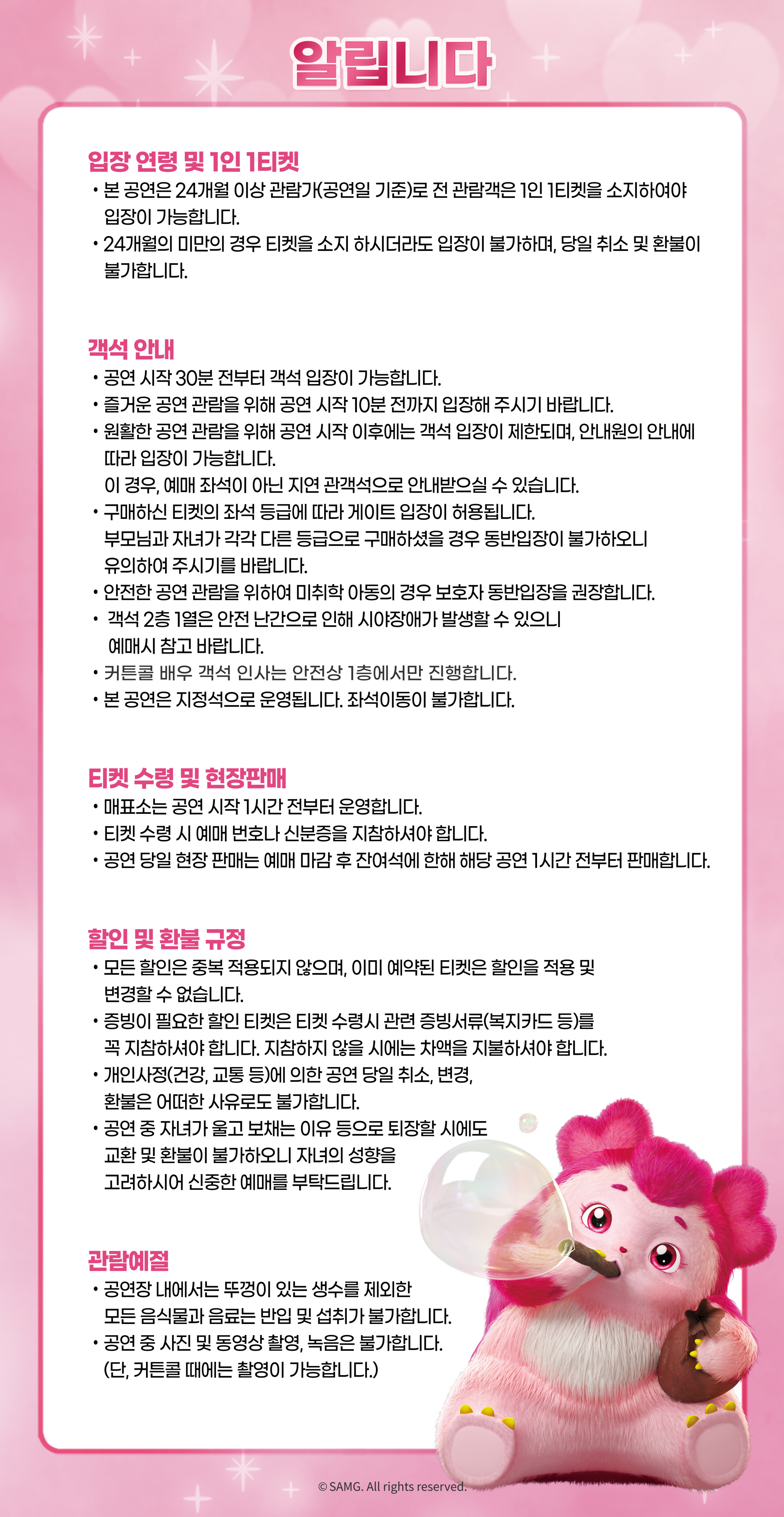 - 관람일 2일전 ~ 취소기한까지: 티켓금액의 30%