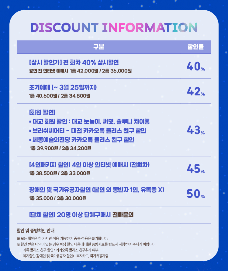 - 특정 기간, 특정 공연일에만 판매하는 가격이 있으니 예매 전 [가격 전체 보기]를 눌러 확인해 주세요.