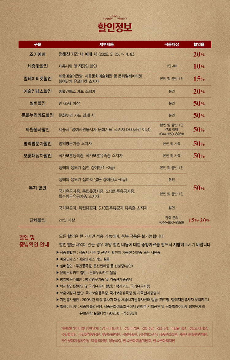 - 특정 기간, 특정 공연일에만 판매하는 가격이 있으니 예매 전 [가격 전체 보기]를 눌러 확인해 주세요.