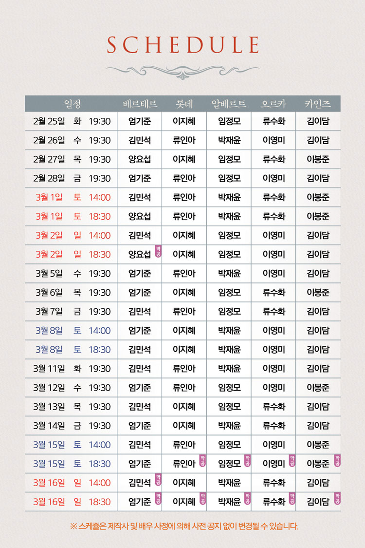 화, 수, 목, 금 19시 30분 │ 토, 일 및 공휴일 14시, 18시 30분│ 월 공연 없음