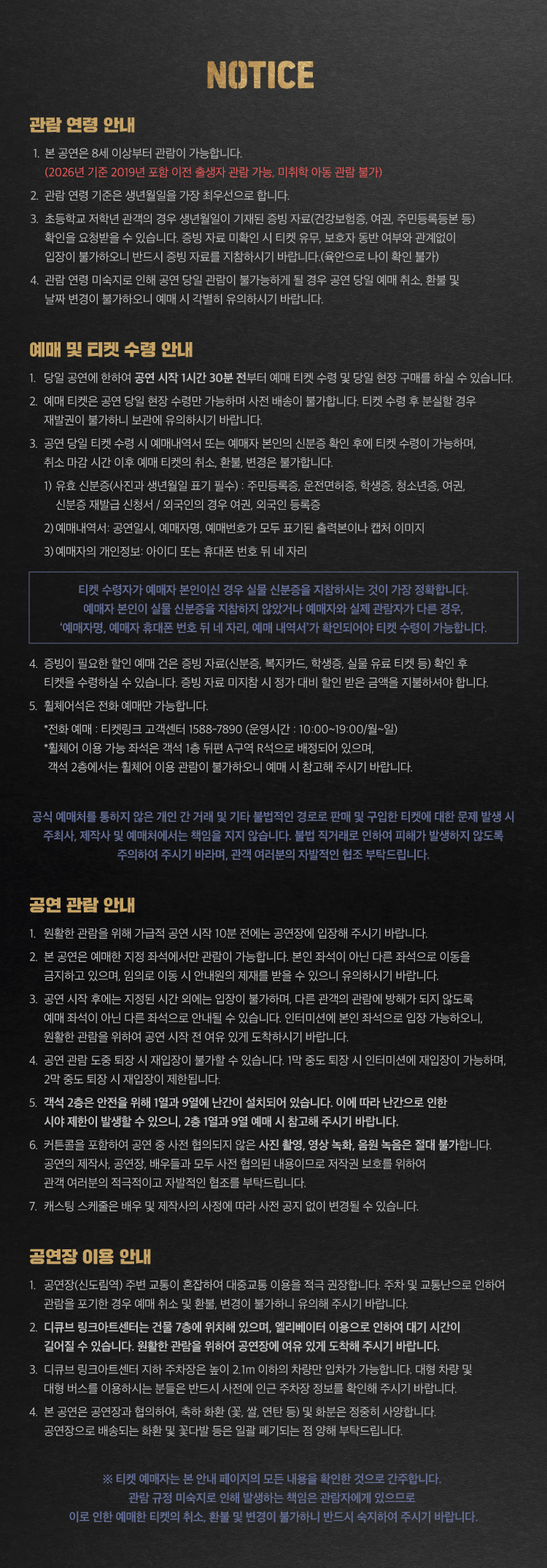 - 관람일 2일전 ~ 취소기한까지: 티켓금액의 30%