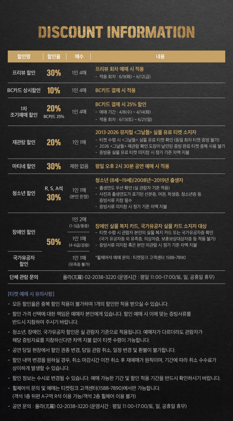 - 특정 기간, 특정 공연일에만 판매하는 가격이 있으니 예매 전 [가격 전체 보기]를 눌러 확인해 주세요.
