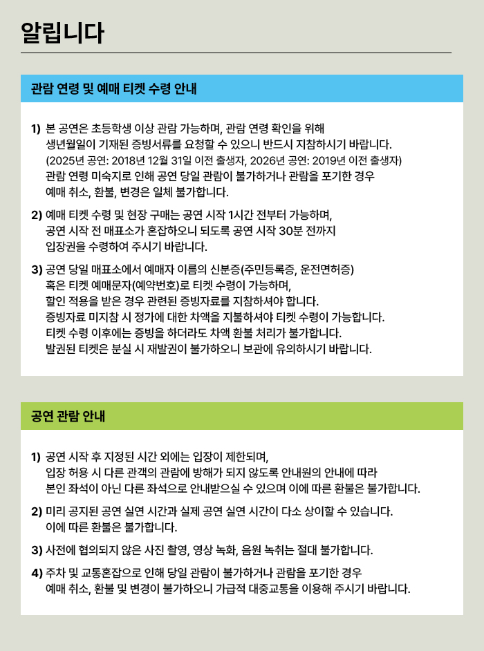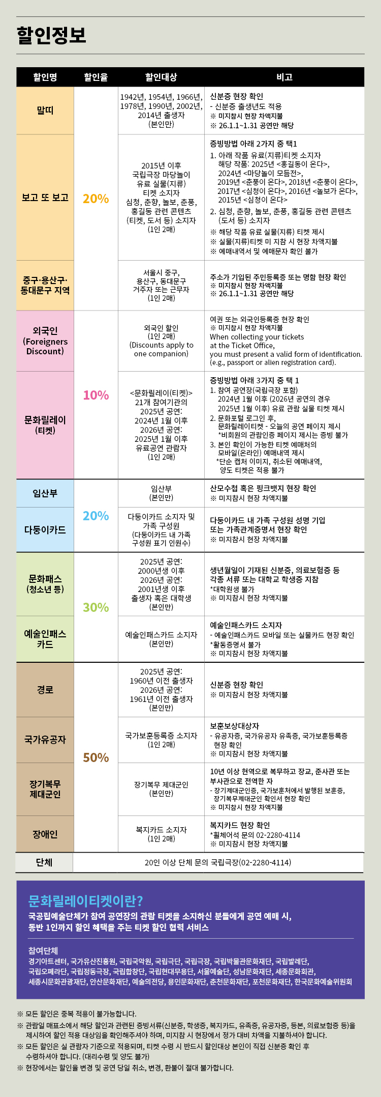 - 관람일 2일전 ~ 취소기한까지: 티켓금액의 30%
