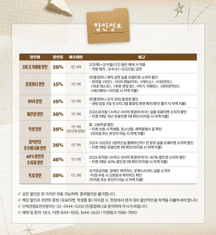 - 관람일 2일전 ~ 취소기한까지: 티켓금액의 30%