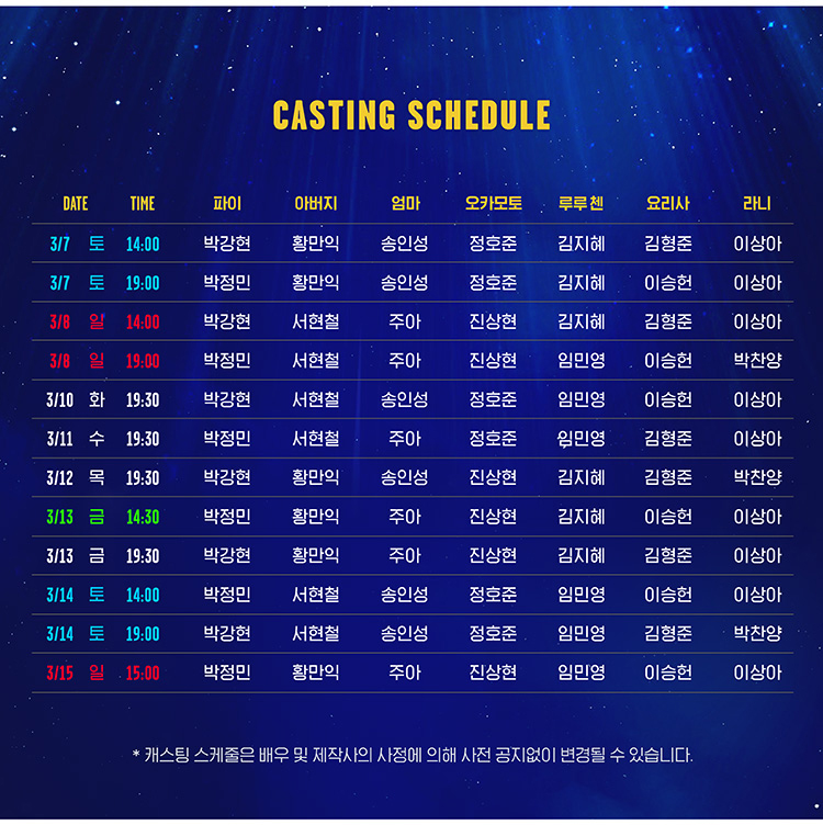 화,수,목 오후 7시 30분 / 금 오후 2시 30분, 7시 30분 / 주말 오후 2시, 7시 (월 공연 없음)