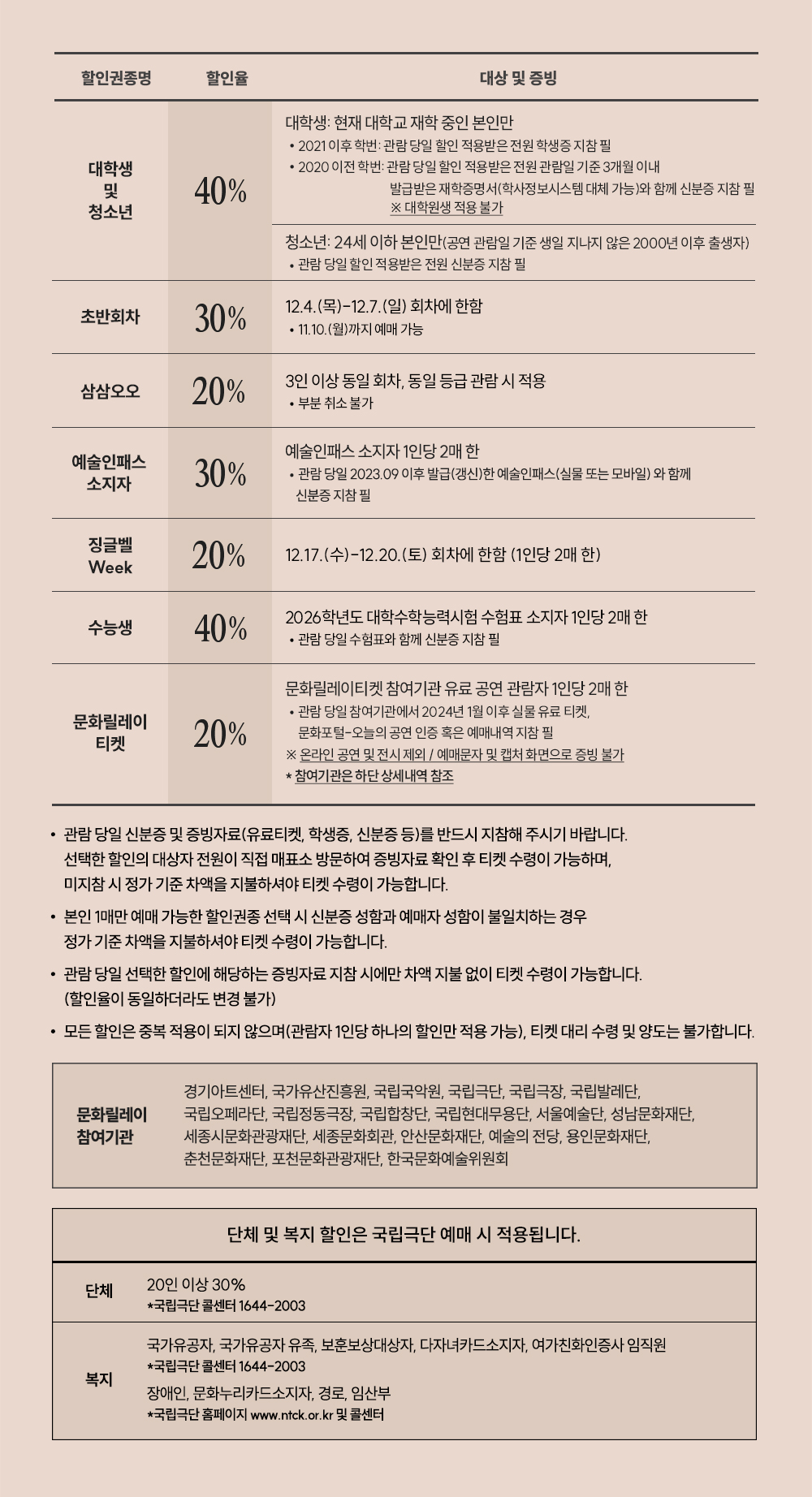 - 관람 당일 예매 시 선택한 할인의 증빙으로만 할인 적용이 가능하며, 증빙자료를 미지참하시거나 해당되지 않는 경우 정가 기준의 차액을 지불하셔야 티켓 수령이 가능합니다.