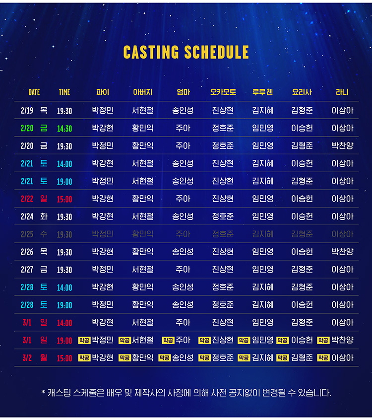 화,수,목 오후 7시 30분 / 금 오후 2시 30분, 7시 30분 / 토 오후 2시, 7시 / 일 오후 3시 (월 공연 없음)