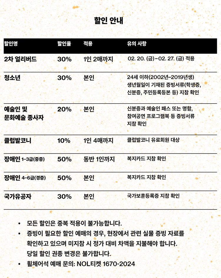 - 특정 기간, 특정 공연일에만 판매하는 가격이 있으니 예매 전 [가격 전체 보기]를 눌러 확인해 주세요.