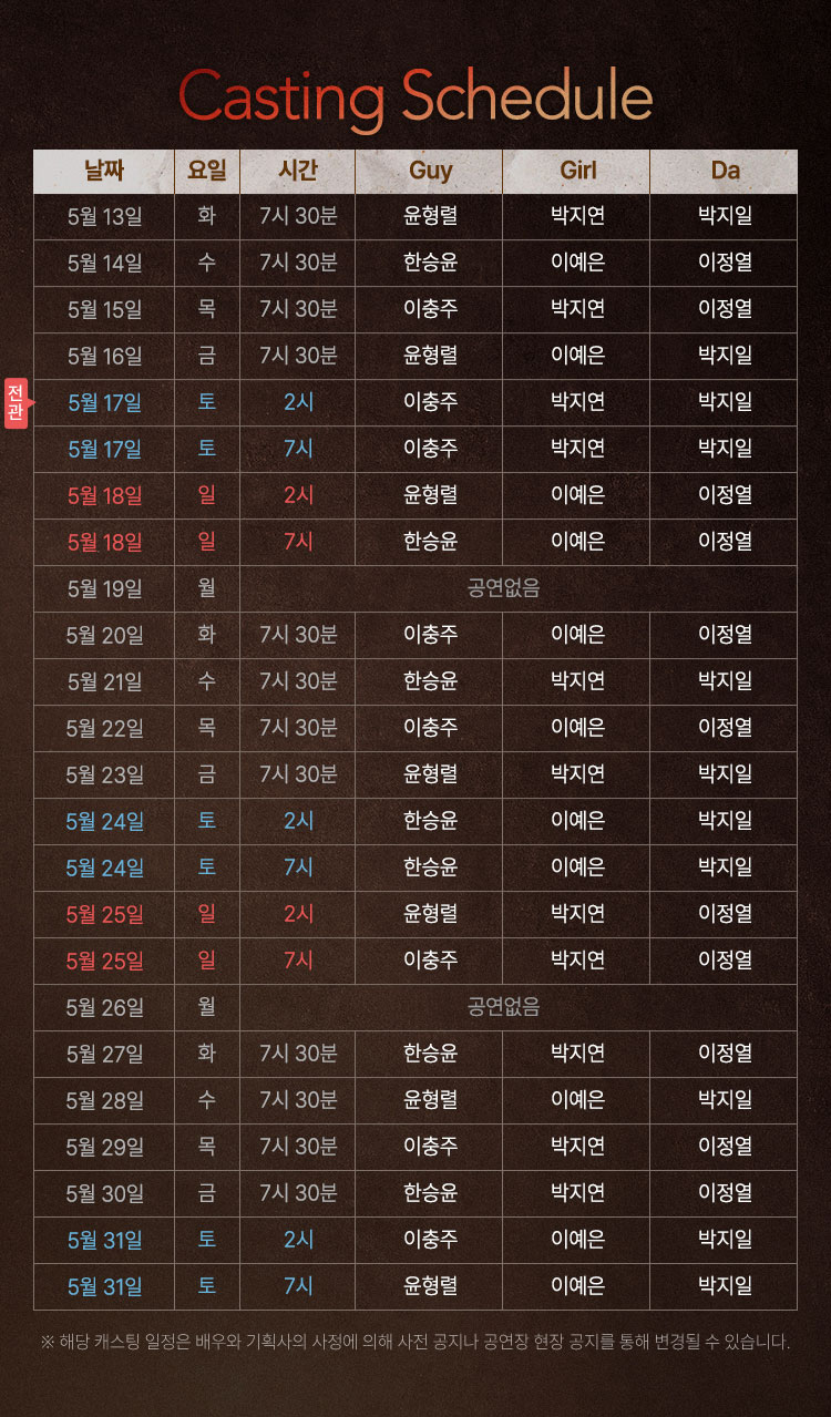 화-금 7시 30분 ㅣ토-일 2시, 7시ㅣ월 공연 없음