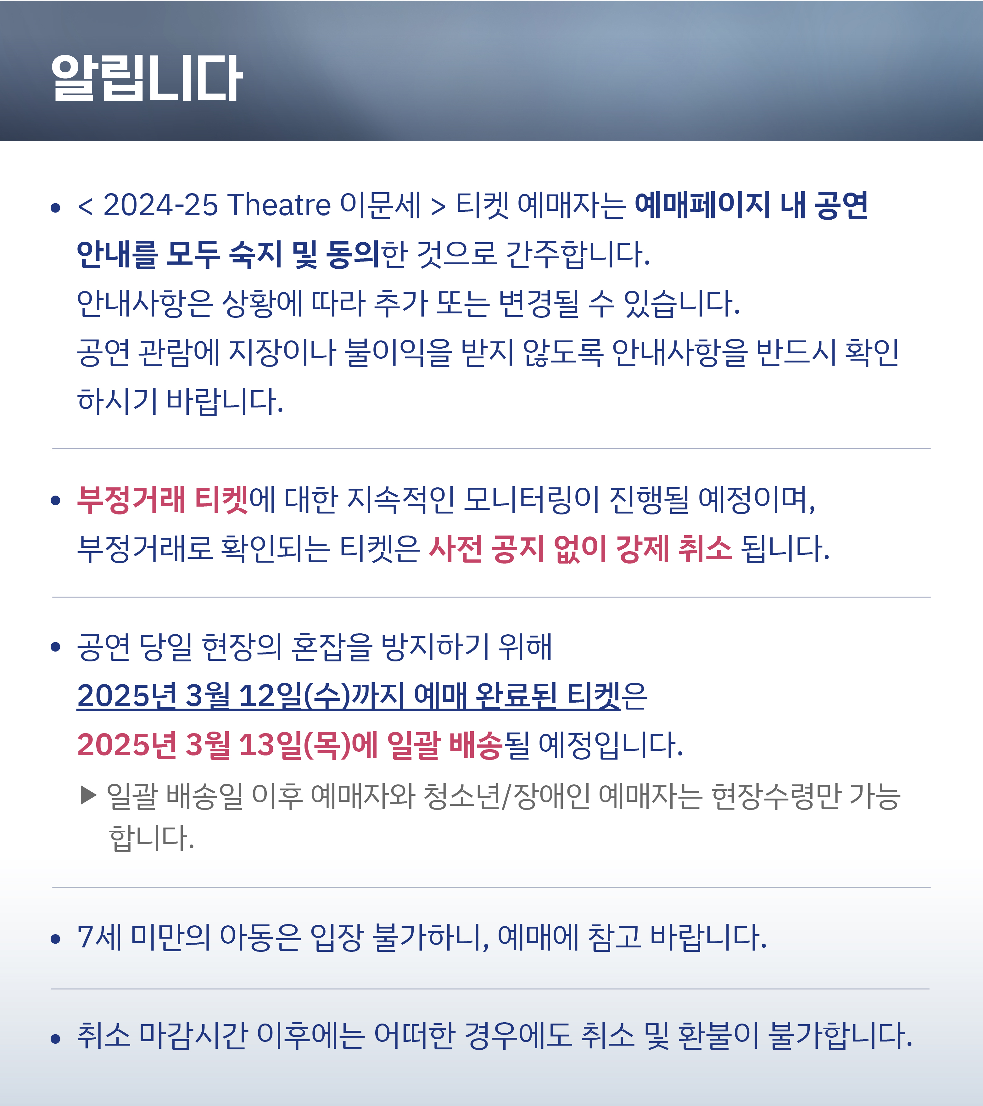 - 예매 후 7일 이내 취소시 티켓 금액 전액이 환불됩니다.(예매 수수료 제외)