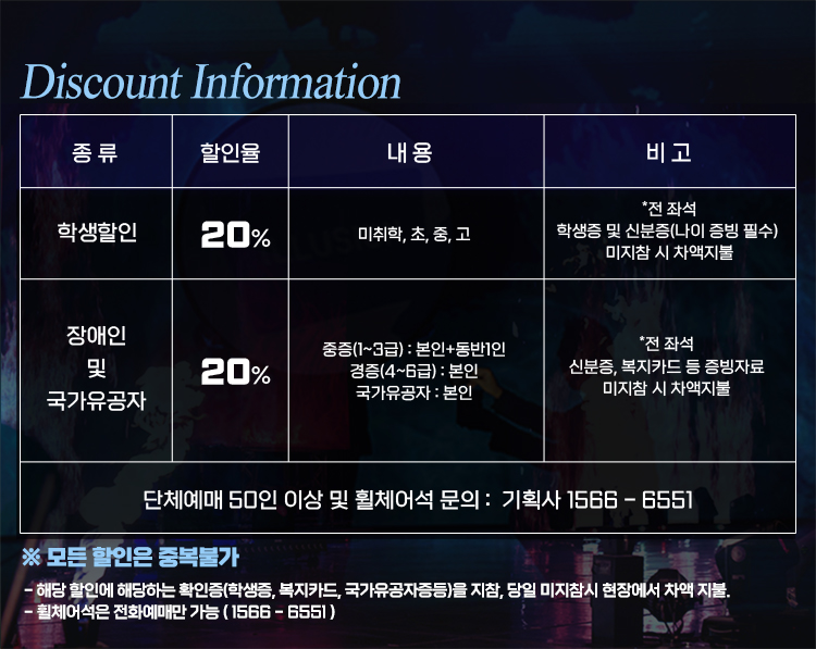 - 예매 후 7일 이내 취소시 티켓 금액 전액이 환불됩니다.(예매 수수료 제외)
