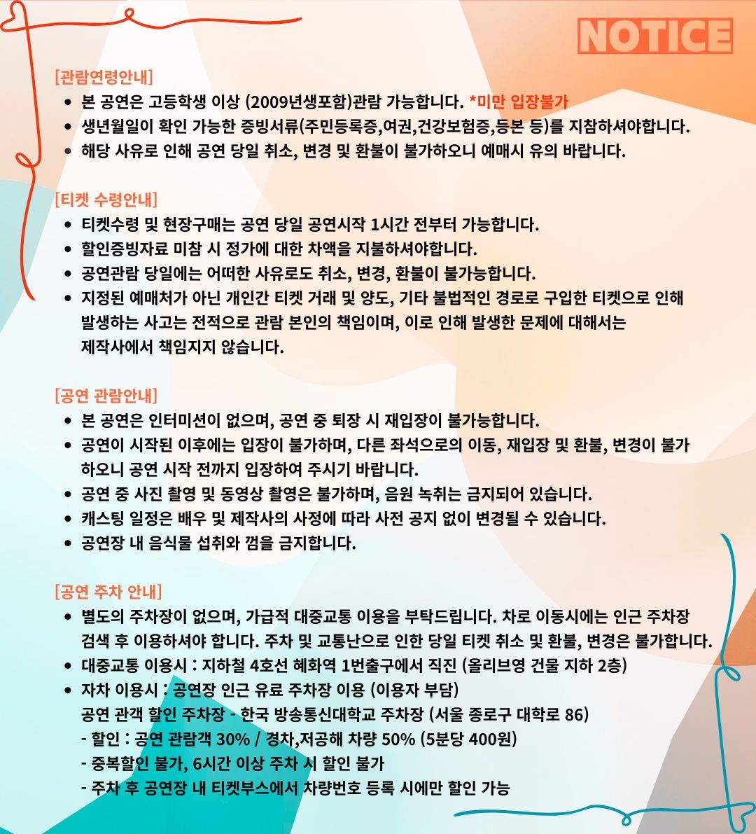 - 공연 시간 : 화,수,목,금 19:30 / 토,공휴일 14시, 18시 / 일 14시 (월요일 쉼)