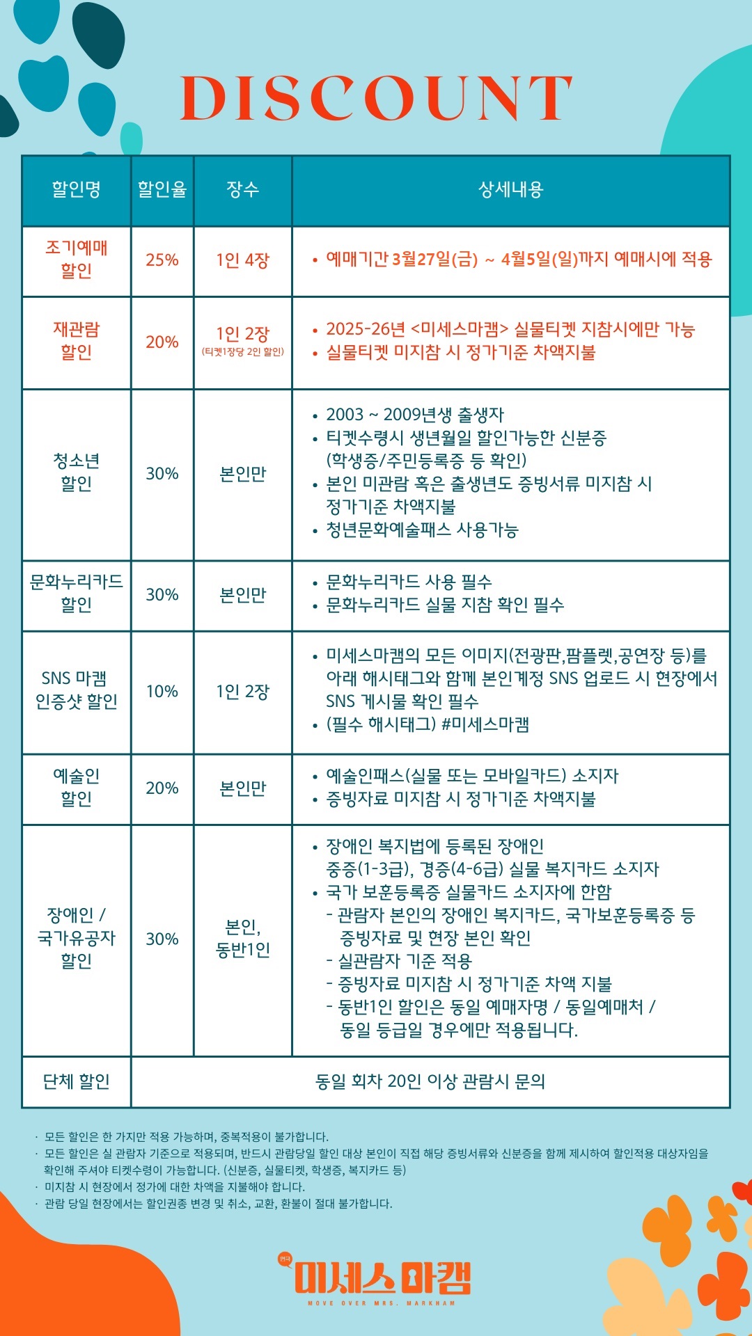 - 관람일 2일전 ~ 취소기한까지: 티켓금액의 30%