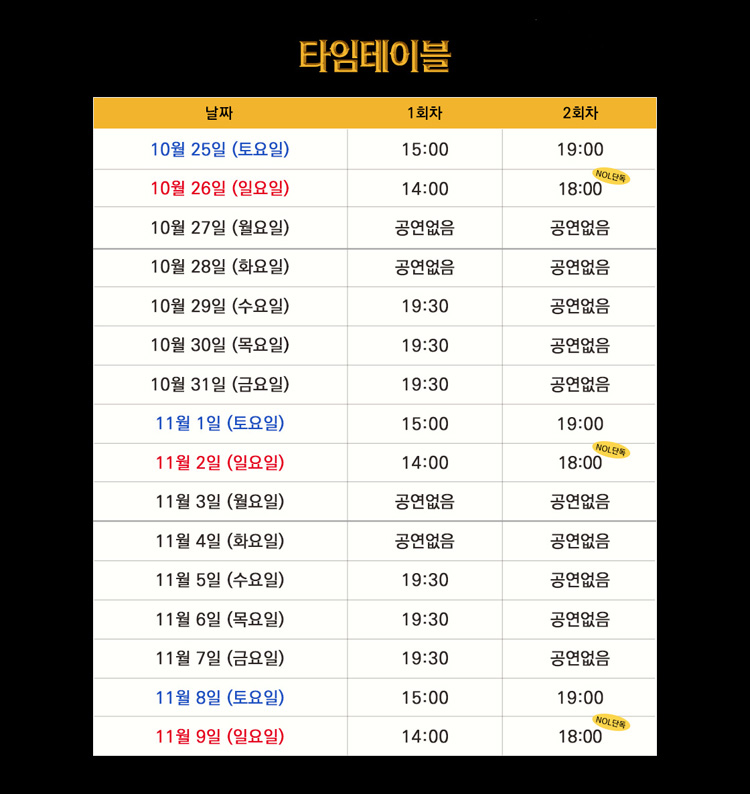 수,목,금 19시30분 / 토 15시, 19시 / 일 14시, 18시