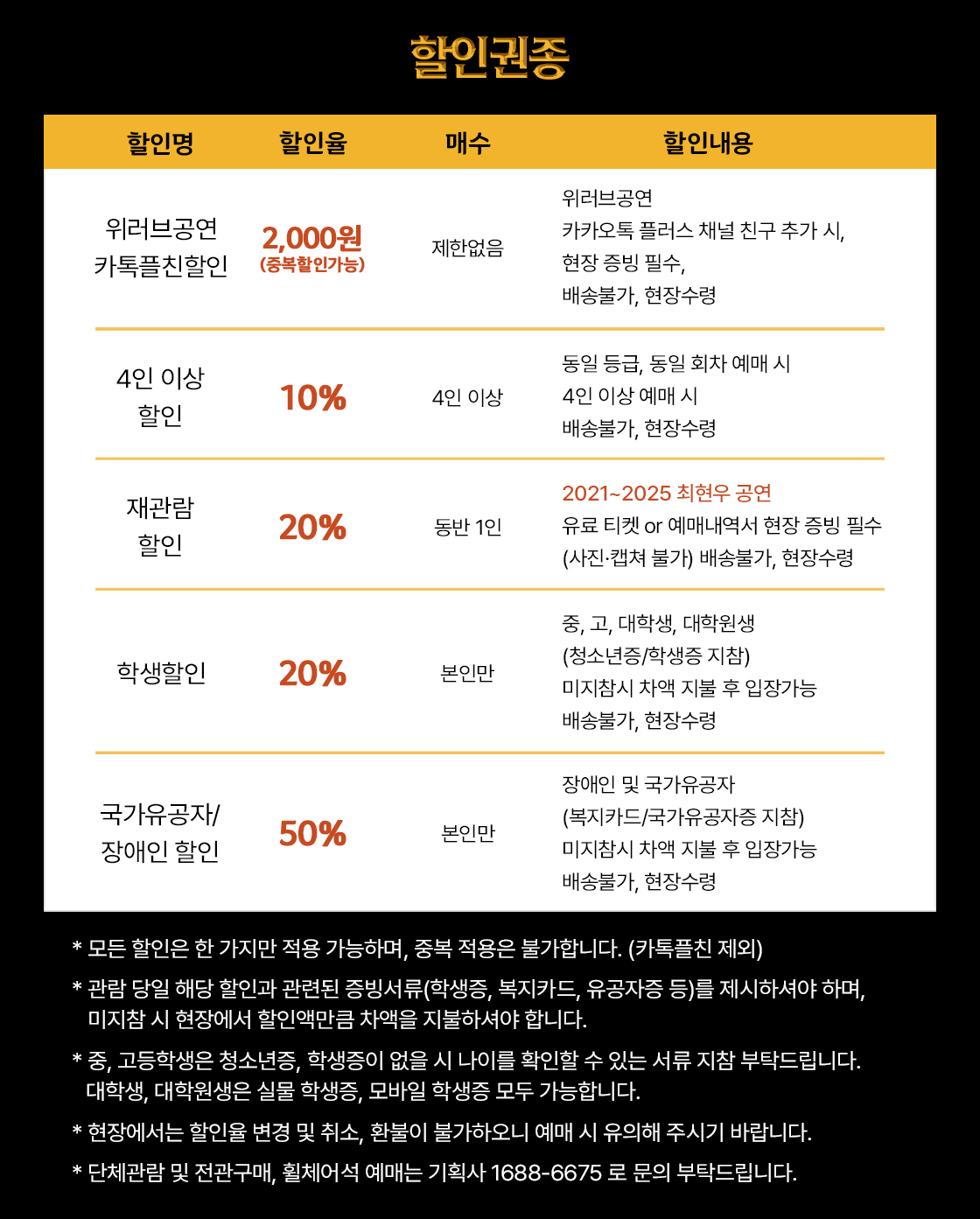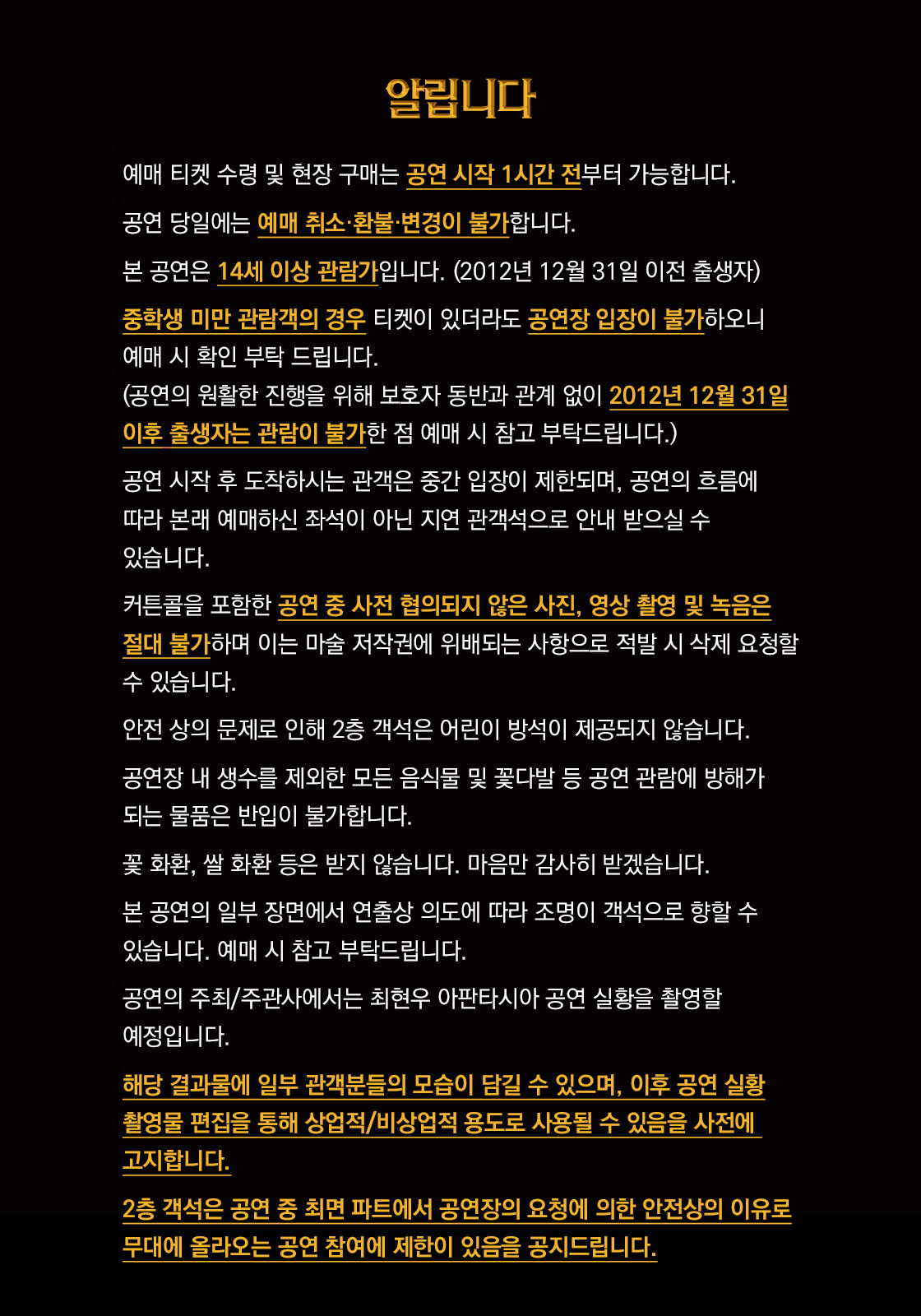 예매가능시간: 평일: 공연 당일 4시간 전 / 주말: 당일 오전 11시