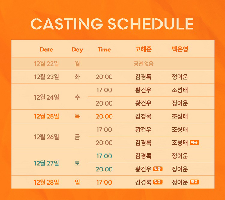 * 12월 10일(수),12월 13일(토), 12월 14일(일) 공연없음