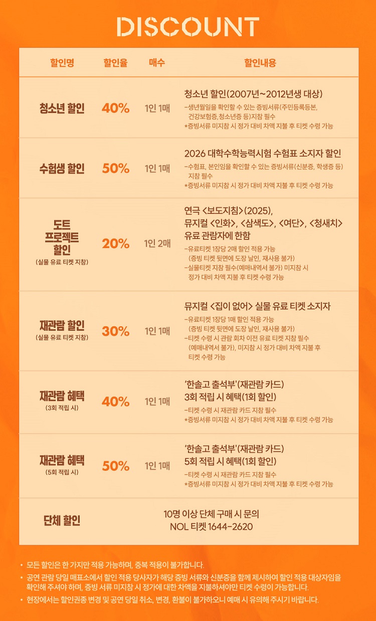 수, 목 20:00 | 금, 토 17:00, 20:00 | 일 17:00