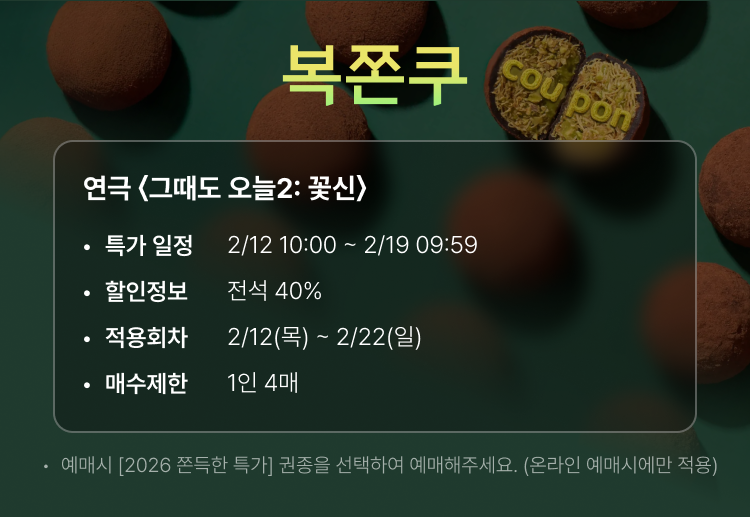 (* 2/16(월), 2/17(화) 공연 없음 | 2/18(수) 2시, 5시 30분 공연 | 2/22(일) 2시 공연)