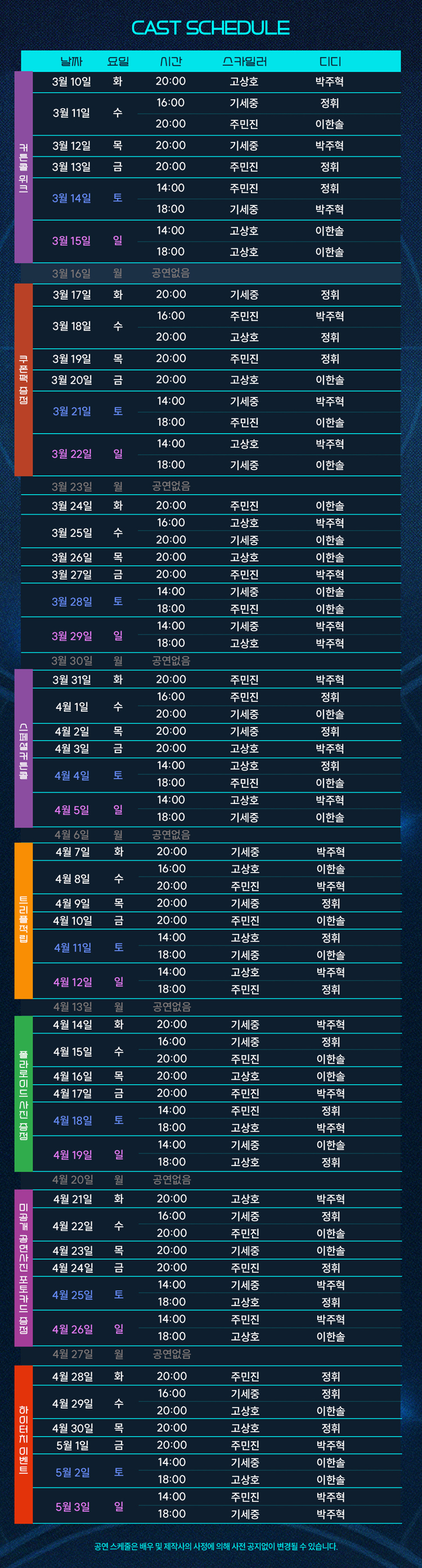 화, 목, 금 8시 / 수 4시, 8시 / 토, 일, 공휴일 2시, 6시 / 월 쉼